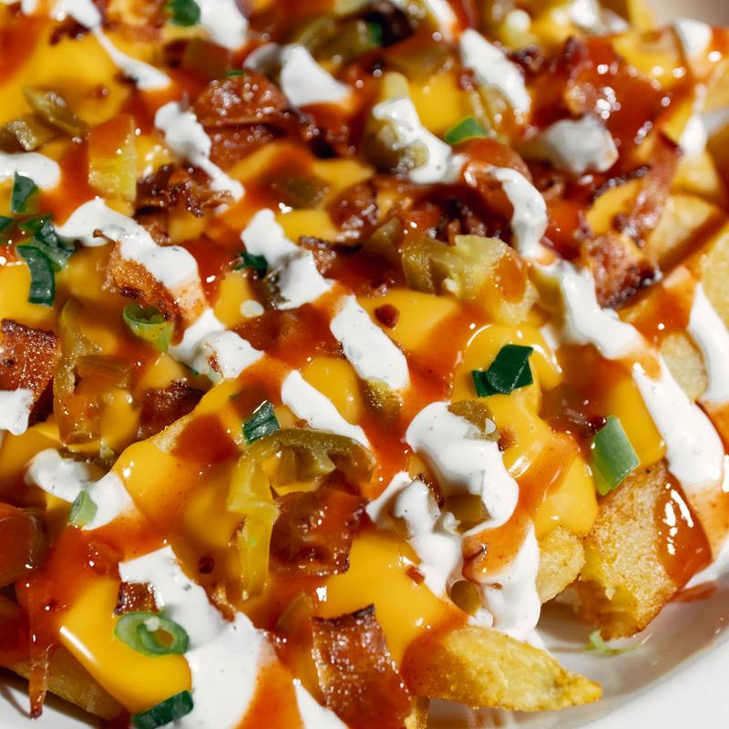 Topped with nacho cheese, drizzled with buffalo sauce & house ranch, topped with crispy bacon, & scallions