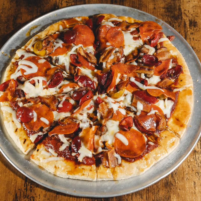 Mozzarella blend, red sauce, pepperoni, sausage, hot honey bacon, cherry peppers, & hot honey drizzle