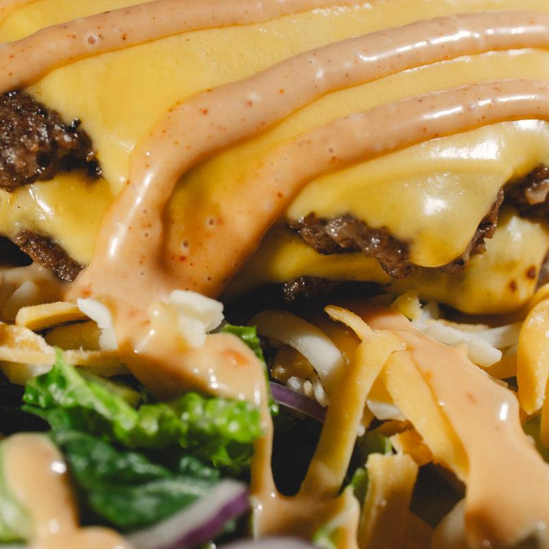 Romaine & iceberg, cheddar, onions & pickles, tossed in Thousand Island and topped with a double Grizzly smash burger